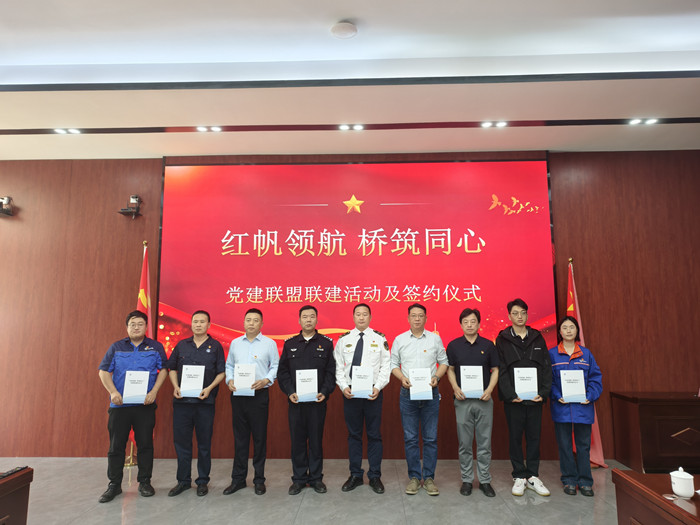本次活動中,九家黨支部代表以“六聯”為主要內容簽訂“紅帆領航 橋筑同心”黨建聯盟協議,將立足武漢都市圈建設發展大局,完整、準確全面踐行創新、協調、綠色、開放、共享的新發展理念,構建政企“共建共治共享”的治理新格局,著力保障漢南長江大橋項目建設安全、綠色、高效推進。