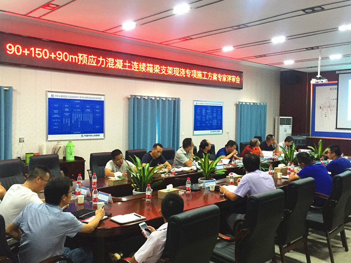 2018年8月24日,北四環公司組織召開90m+150m+90m(3.2萬噸)轉體連續梁支架現澆專項施工方案專家評審會。會議邀請了五名業內資深專家把關。各相關參建單位代表出席了本次會議。與會人員聽取了武漢北四環跨鐵工程項目部人員匯報并發表了有關意見后,經過專家組及相關單位代表認真細致討論,一致認為該方案總體可行,同時也提出了一些局部需修訂完善的意見和建議。