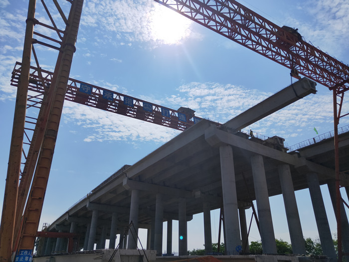 當日下午,在黃陂區新十公路松樹崗施工現場,架橋機正在架設最后一跨40米的簡支箱梁。北四環第三標段主要負責1.155公里的橋梁施工,其中包含4跨連續梁水平轉體施工,以及17孔212片箱梁架設施工。去年11月,該標段成功完成4座轉體橋的轉體工程,這也是國內首次一個項目在1公里范圍內有連續4座轉體橋,也是國內最密集的轉體群,轉體群總重量更是高達創紀錄的11.5萬噸。