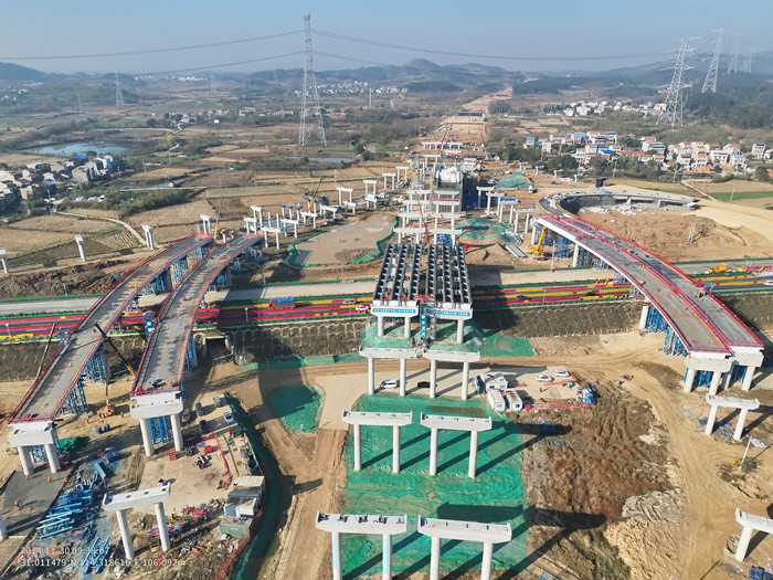 研子崗樞紐互通跨武漢至大悟高速公路6聯鋼箱梁總用鋼量約4350t,各聯均采用支架吊裝法施工。主線橋為單跨簡支鋼混組合梁,跨徑62m,左右兩幅對稱布置,總寬34m,用鋼量785t;匝道橋共4聯,各匝道均為組合跨徑(40+60+40)m連續鋼箱梁。該處鋼箱梁跨越雙向六車道的武大高速,涉路施工手續辦理復雜,協調難度大,跨徑大,施工安全風險大,現場吊裝焊接質量管控難度大,項目公司組織參建單位提前部署、優化方案、多級聯動,截至11月29日,研子崗樞紐互通跨武漢至大悟高速公路6聯鋼箱梁安全順利完成吊裝。