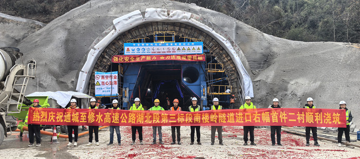 南樓嶺隧道(湖北段)為武漢交投集團(tuán)投資建設(shè)的首條隧道,通修高速止于兩省交界的南樓嶺處,通過隧道方式與江西段對(duì)接,南樓嶺隧道全長2743.6m,其中湖北境隧道長1425.6m。為確保南嶺樓隧道首件二襯的順利澆筑,項(xiàng)目公司多措并舉,扎實(shí)做好澆筑準(zhǔn)備工作,根據(jù)隧道地質(zhì)、施工條件及混凝土特性,集結(jié)技術(shù)專家開展深入研討,精心編制首件二襯混凝土澆筑專項(xiàng)方案:對(duì)原材料選型、配合比調(diào)試反復(fù)推敲;采用先進(jìn)智能二襯鋼模臺(tái)車,確保混凝土澆筑的均勻性、密實(shí)性,大大提高施工效率和質(zhì)量;對(duì)施工準(zhǔn)備、防水卷材鋪設(shè)、排水管道安裝、鋼筋安裝、二襯臺(tái)車定位、模板加固、混凝土澆筑等工藝流程按要求嚴(yán)格把關(guān);澆筑過程中,安排專人全過程旁站,嚴(yán)格把控施工工序,確保各施工環(huán)節(jié)緊密銜接;嚴(yán)格按照規(guī)范圖紙要求驗(yàn)收,確保襯砌施工全過程的安全質(zhì)量可控;嚴(yán)格落實(shí)首件工程制,為后續(xù)施工提供寶貴的經(jīng)驗(yàn)和參考價(jià)值。