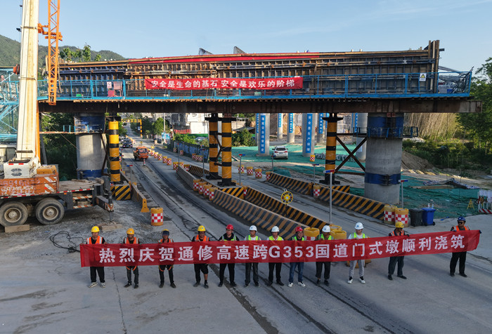 G353國道鄂贛交界處,是連接兩省的唯一一條國道,交通疏導和管制壓力大,作業安全風險高。為確保門式墩順利澆筑,項目團隊提前謀劃、精心組織,周密部署,反復優化施工方案,巧妙化解改路及支架體系難題;組織多方協調聯動,拓寬道路寬度,沿路設置限高架、警示牌、爆閃燈、減速帶,輔以動態交通管制,確保跨路施工交通安全;落實“公司-項目-班組”三級技術交底模式,多次組織召開方案技術和安全交底培訓會,確保施工人員全面掌握技術要點,嚴格把控每一個施工環節,確保門式墩順利澆筑。