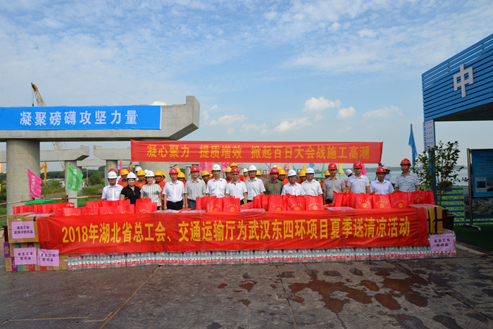 驕陽似火,熱浪襲人。7月26日,湖北省總工會黨組成員、副主席李春舫在省交通運輸廳工會副主任江飛、省交通運輸廳重點建設辦副主任徐建明一行的陪同下,來到武漢交投集團東四環(huán)線項目建設工地,看望慰問高溫下堅守在重點工程建設一線的產(chǎn)業(yè)工人,向他們送去夏日里的一片“清涼”。武漢交投集團黨委副書記、總經(jīng)理陳順平,黨委副書記、紀委書記楊凡,集團總經(jīng)理助理、東四環(huán)公司總經(jīng)理王先強參加了慰問活動。