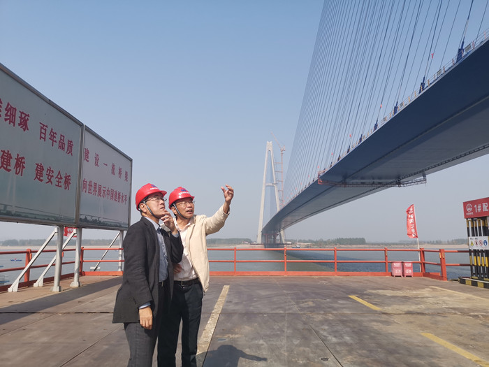 2019 年 11月,青山長(zhǎng)江大橋總設(shè)計(jì)師徐恭義(右)向國(guó)際橋協(xié)專(zhuān)家介紹青山橋。