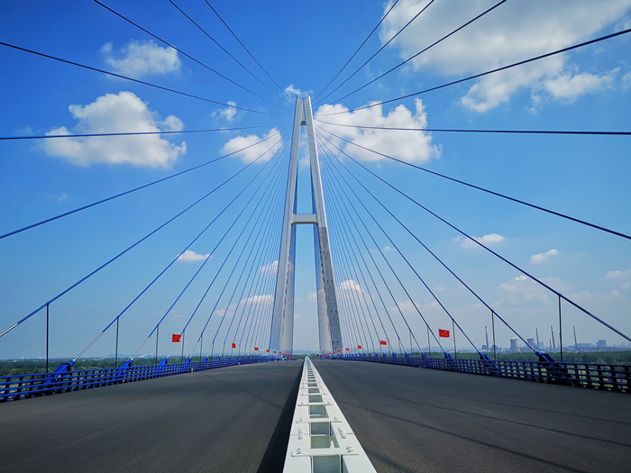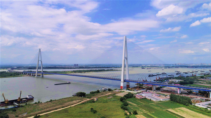 看青山橋,須晴日,當(dāng)遠(yuǎn)觀。兩座云白色的橋塔直沖云霄,與朵朵白云相映襯,撐起南北兩岸巨傘般的252根天藍(lán)色斜拉索,與上下游的青山綠水交相輝映,構(gòu)成長(zhǎng)江主軸上一幅水天一色的美景。