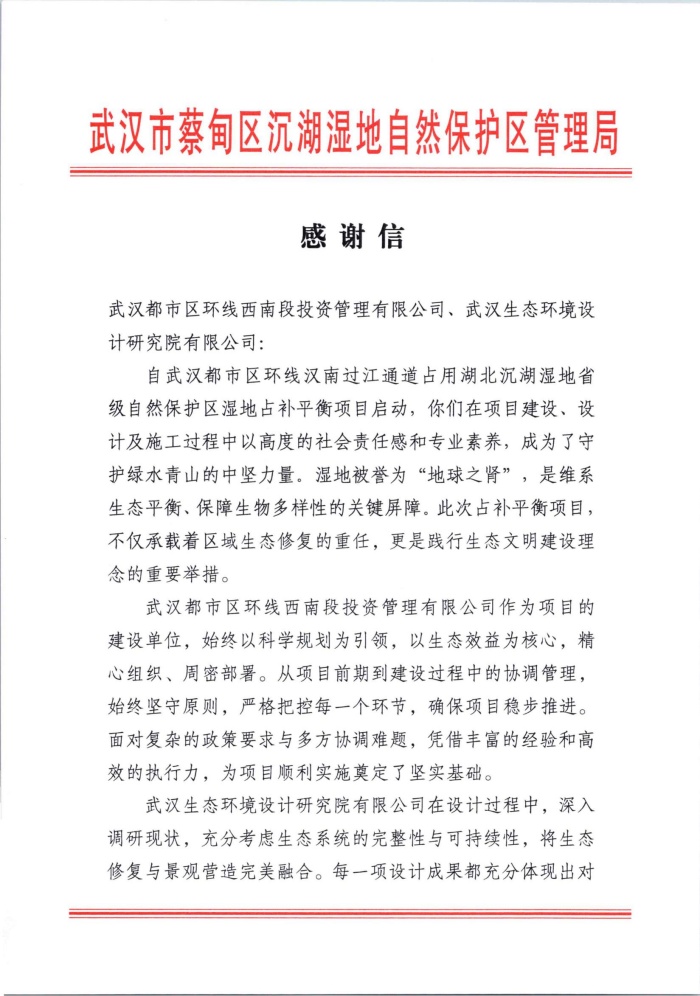 初夏六月,荷尖初露,武漢都市圈環線高速公路漢南長江大橋及接線工程沉湖濕地保護區內蛙鳴漸起、蒲草搖曳,處處涌動著蓬勃生長的活力。在這萬物競發的美好時節,項目團隊收到了來自蔡甸區沉湖濕地自然保護區管理局的感謝信。信中特別指出,項目團隊以科學的生態修復方案和高效的執行能力,在重大交通基礎設施建設與濕地生態保護間找到了平衡點,繪就了建設發展與生態保護同頻共振的和諧圖景,為同類項目樹立了標桿。這也標志著該項目濕地“占補平衡”工作圓滿收官,在兼顧生態效益與工程可行性具體實踐路徑上又探索出了新路徑。