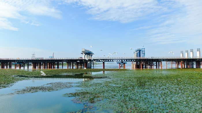 如今,當全長8300余米的斧頭湖一號鋼棧橋如鋼鐵長龍橫臥水面,其映照的不僅是建設者的汗水,更是生態優先的答卷。鋼棧橋及主體工程施工期間,斧頭湖作業區水質監測數據持續優良,周邊濕地未受侵擾。正是這份對自然的敬畏,引來了白鷺的棲息。它們掠過工地林立的樁基,停駐在防護網外的淺灘,儼然成為生態成效的“第三方認證”——工業巨人以謙卑姿態與自然對話,終獲生靈信任。